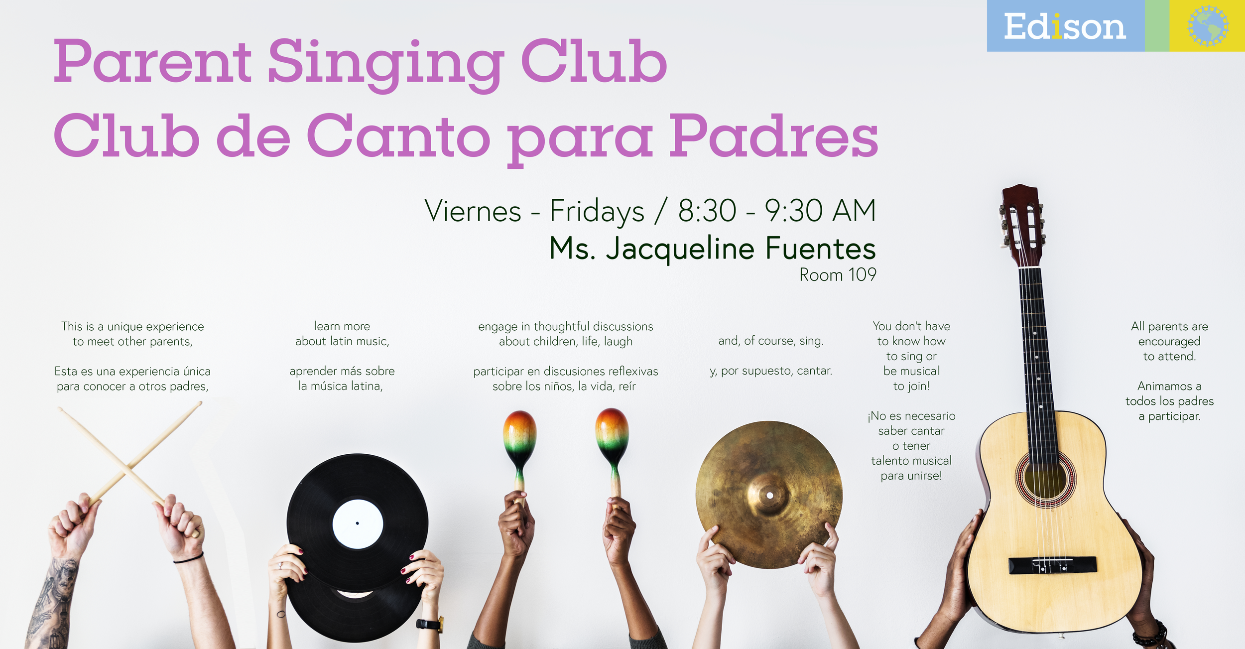 Thanks to a repertoire carefully selected by Jacqueline Fuentes, Edison families have the opportunity to learn rhythms and melodies from multiple hispanic world cultures, and songwriters whose lyrics invite you to reflect on different social, cultural, historic and emotional topics. It’s also an opportunity to learn basic breathing elements and vocal technics from one of the great voices of Latin America.