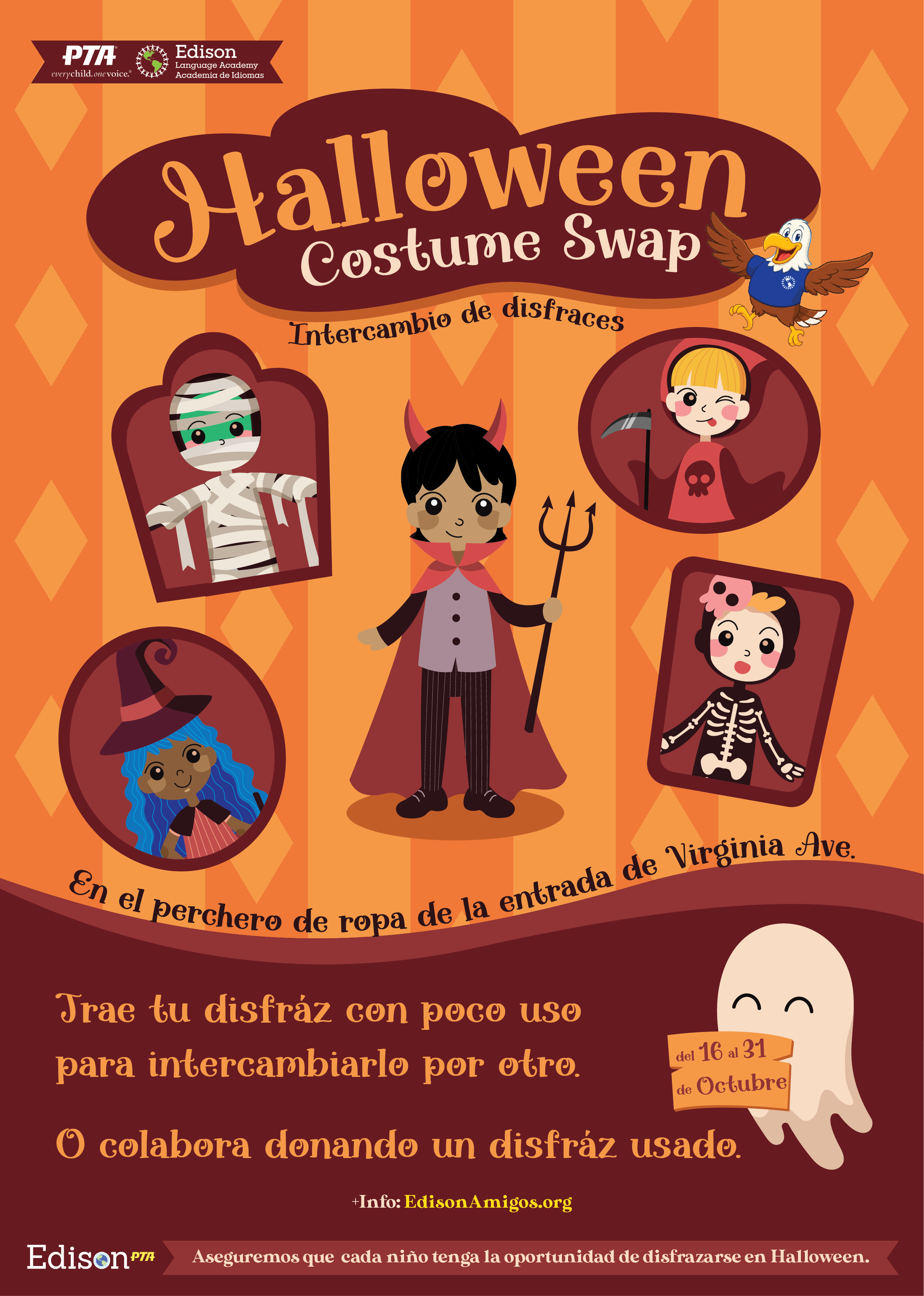 ¡Este año, Edison-PTA está interesada en intercambiar disfraces de Halloween nuevos o ligeramente usados para niños desde edad preescolar hasta de 5to grado con el “Costume Swap”!