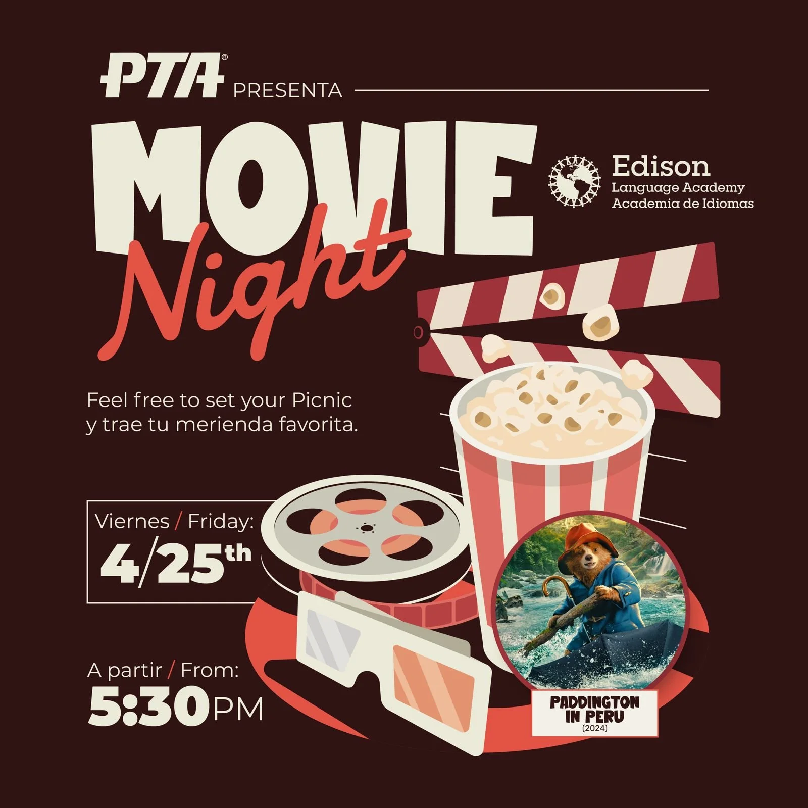 ¡Familias de Edison! Disfruten de Paddington en Perú en el cafetorium de Edison este viernes, 25 de abril, a las 5:30pm. Traigan su propio picnic y vean la película en compañía de otras familias de Edison (NO habrá venta de comida).