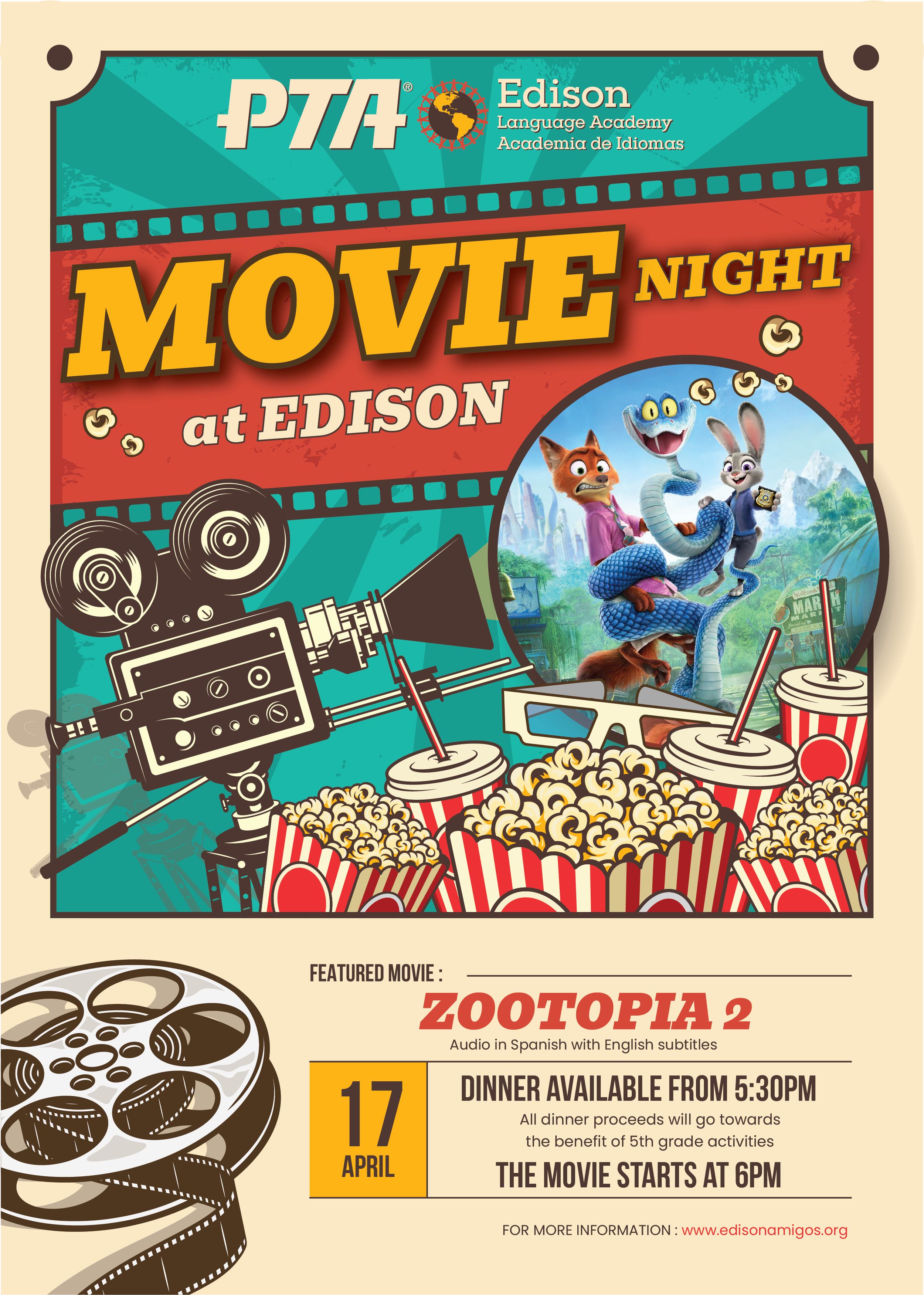 Ven a disfrutar con los chicos de 3º al 5º grado la proyección de la película “Zootopia 2” (2025). Puedes venir con tu pijama, manta, almohadita y además disfrutar del rico menú que se ofrecerá a beneficio del 5to grado.